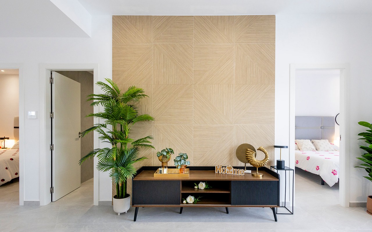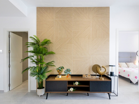Step inside to a bright and airy open-plan living space, where large sliding doors flood the room with natural light and provide seamless access to the private garden and pool area. The modern kitchen, designed for both functionality and style, comes fully equipped with white goods as a special launch offer, making this home move-in ready.