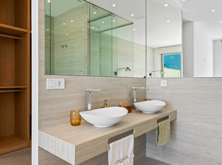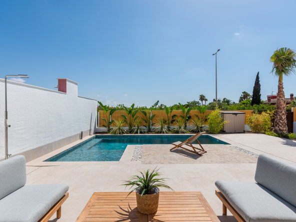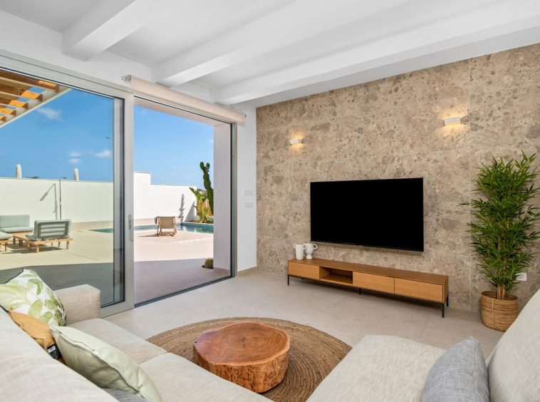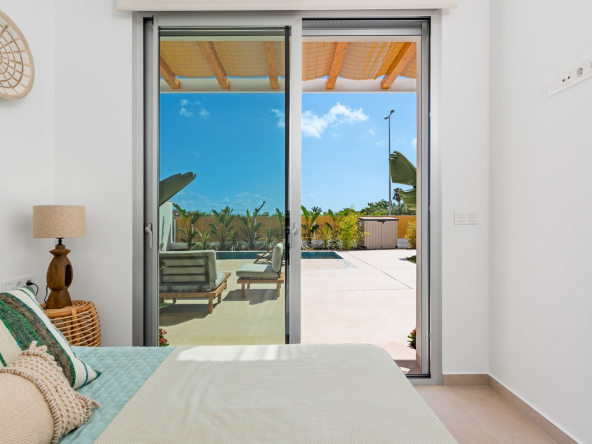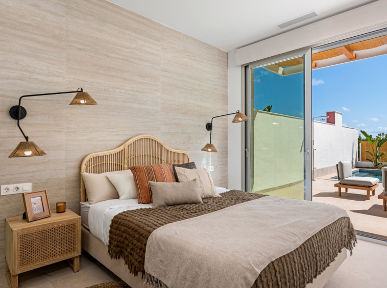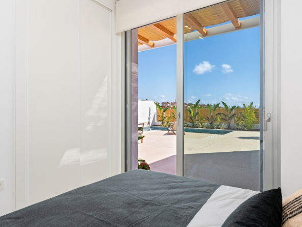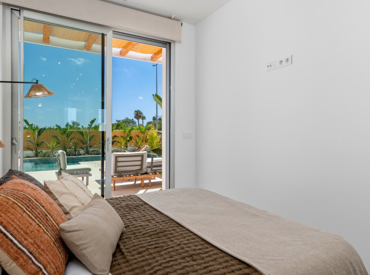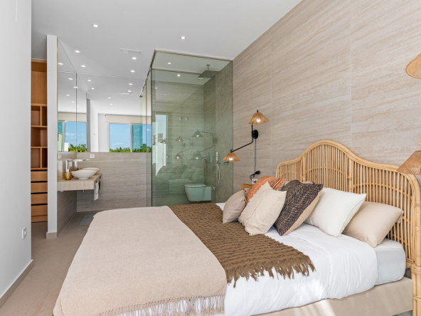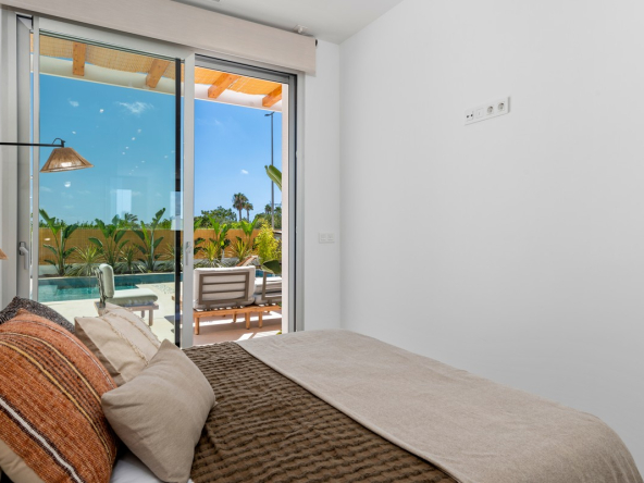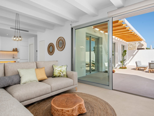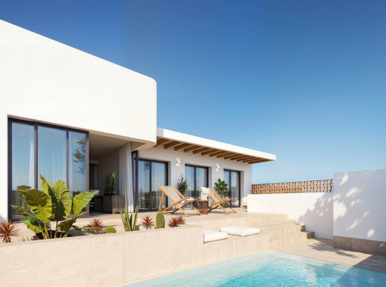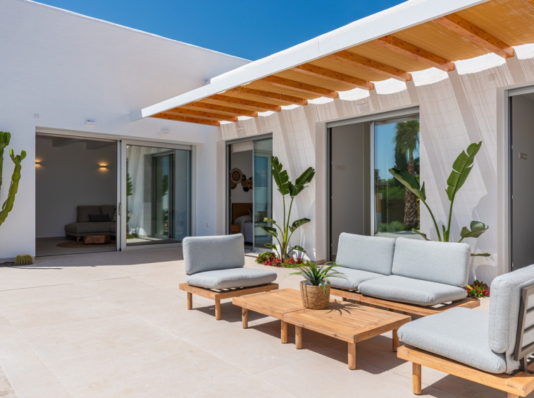These elegant homes showcase a contemporary Ibizan design with clean lines and bright white façades. The architecture blends modern comfort with Mediterranean character. As a result, each villa feels both stylish and welcoming.